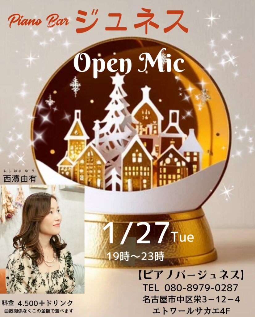 恒例となりました、ジュネスでのオープンマイクは1月27日になりました。 ジュネスは温かいママさんが迎えてくれる住吉の老舗ピアノバーです。 日時:2026年1月27日(木)19時00分〜23時場所:ジュネス料金:4,500円+ドリンク代 申込みはこちら 申込みフ... -