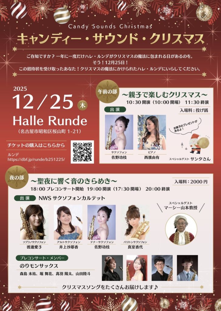 12月25日のクリスマスの日に、昭和区桜山のハレ・ルンデのクリスマスイベントの午前に行われる、「親子で楽しむクリスマス」に、サックスの佐野功枝さんと出演します。